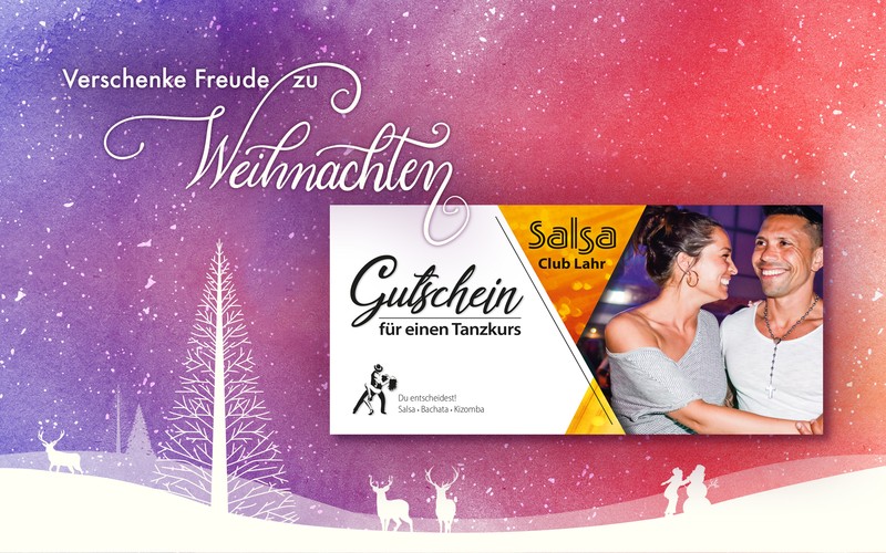 Überrasche deine Liebsten mit einem Tanzkurs. Bei uns im Salsa Club Lahr erhältlich als hochwertiger Gutschein per Post oder zum selbst ausdrucken, wenn es schnell gehen muss. Anfragen bitte nur über unser Kontaktformular. Wähle ganz einfach einen Geldbetrag, der dann mit einem Salsa, Bachata oder Kizomba Kurs verrechnet werden kann.